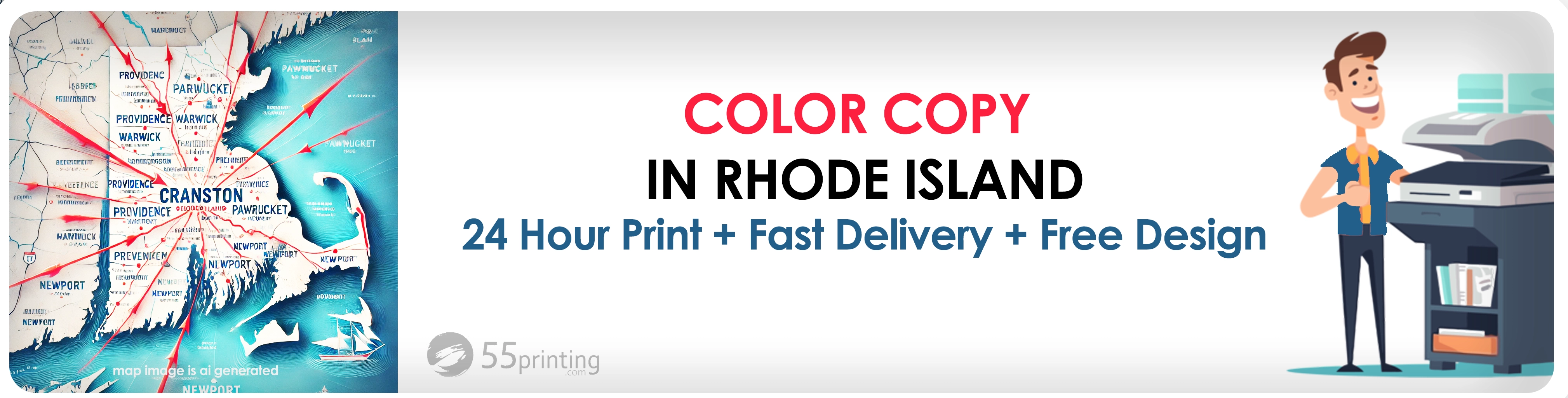 At 55Printing.com, we offer comprehensive color copying and document printing services throughout Rhode Island. Whether you're in Providence, Cranston, Warwick, Pawtucket, or any other city or town, our team is dedicated to delivering high-quality prints tailored to your specific needs.