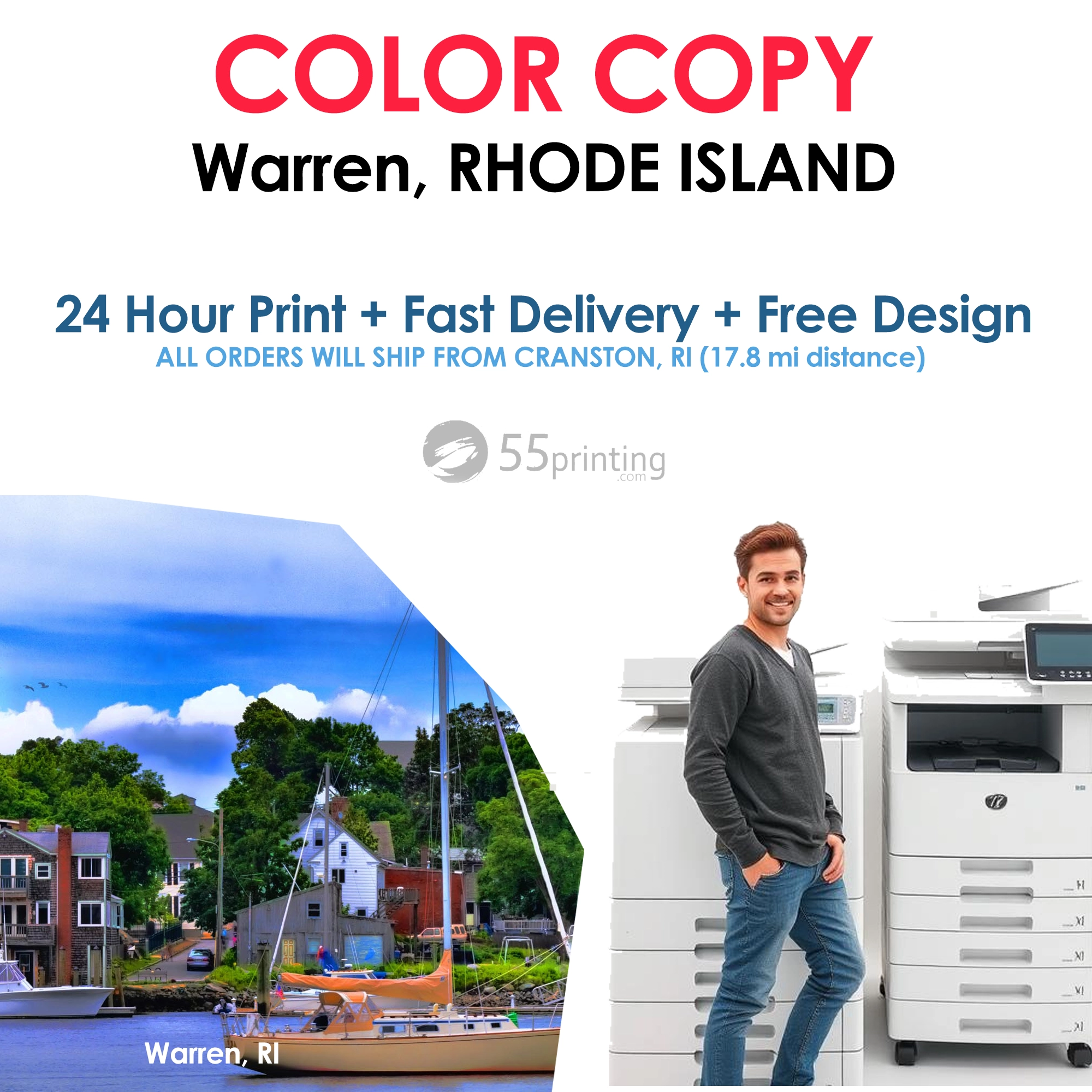 Welcome to 55printing, your trusted partner for fast, affordable printing in Warren, RI! Based just a short drive away in Cranston, RI, we specialize in delivering high-quality color copies and black & white copies with an unbeatable 1-day delivery promise. Whether you’re a small business owner needing vibrant flyers, a school teacher printing worksheets, or an event planner creating eye-catching posters, we’ve got you covered. Warren, with its historic charm and tight-knit community of about 10,000 residents, deserves a printing service that matches its pace and personality—and that’s exactly what we offer.