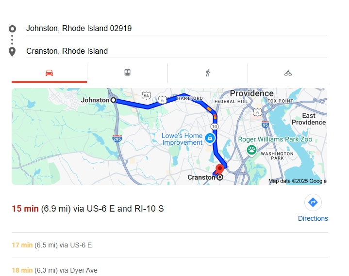 - Use major highways such as I‑95 and local connectors for a direct route from Cranston to Johnston.