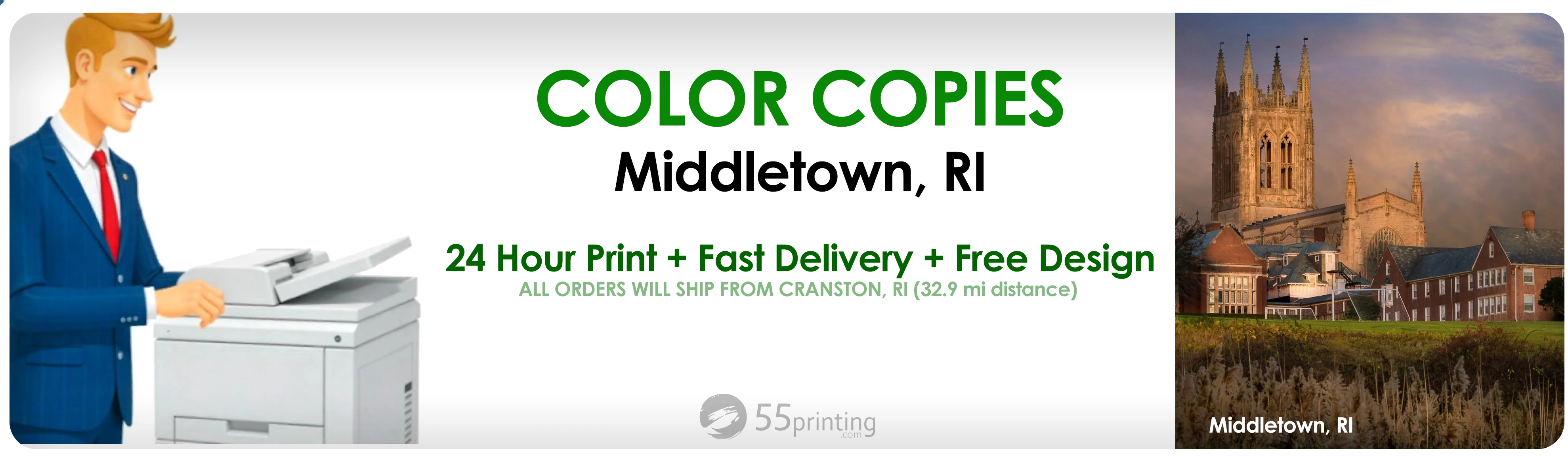 Although our cutting-edge printing facility is located in Cranston, RI, our express 1-day service is specifically designed to serve the Middletown community with exceptional efficiency. The short distance between Cranston and Middletown ensures that your print orders are handled with minimal transit time, guaranteeing rapid delivery.