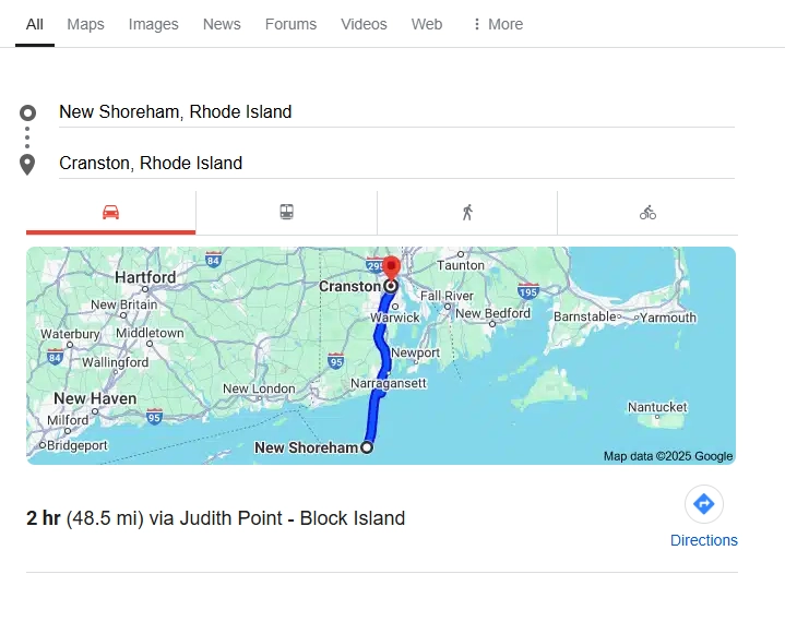 | New Shoreham to Point Judith | 30 minutes (ferry ride included) | Block Island Ferry Terminal |