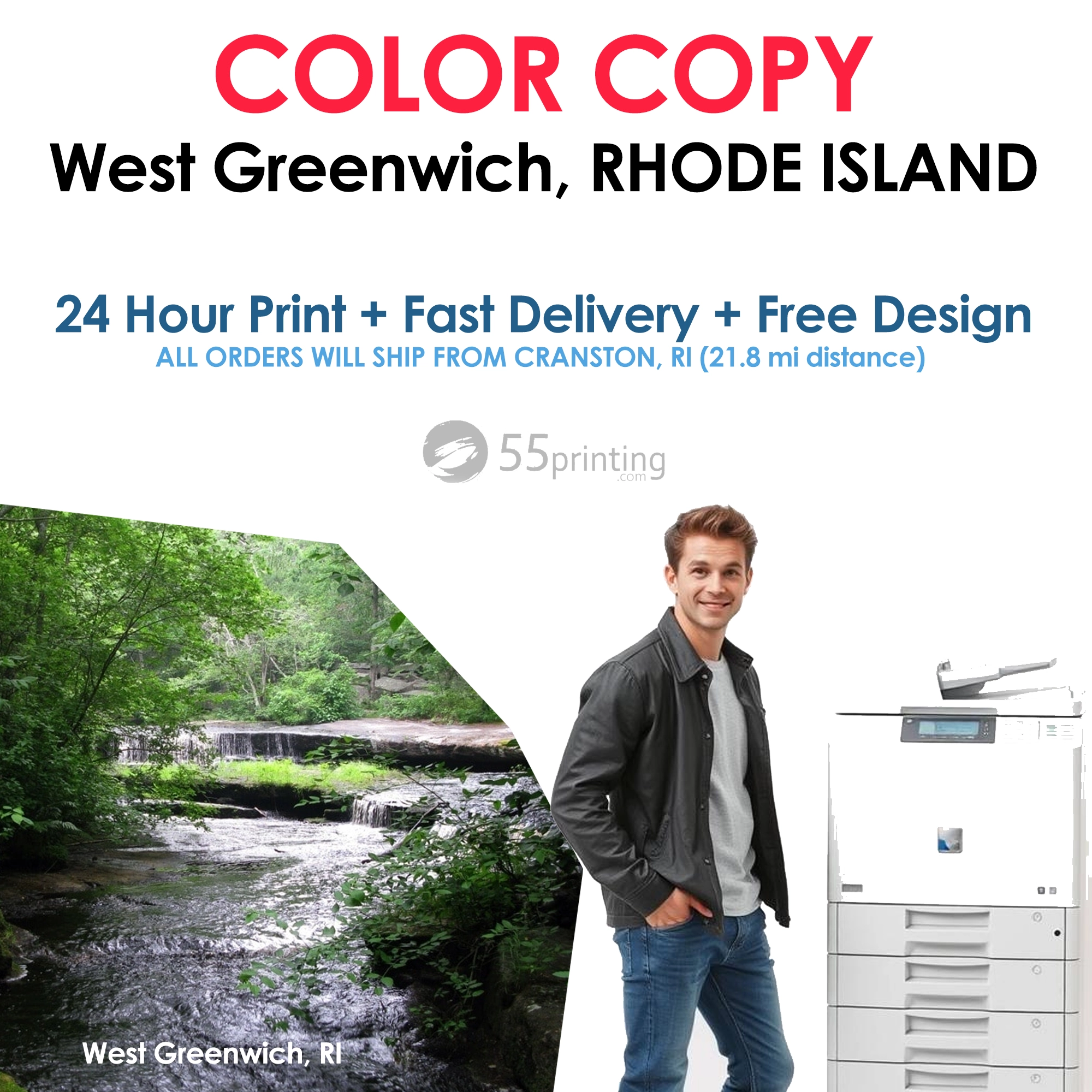 Choosing 55printing brings West Greenwich, RI, a host of benefits tailored to its rural community. 1. Speed: Our 1-day delivery printing West Greenwich ensures your color copies West Greenwich RI arrive the next day—perfect for urgent flyer printing West Greenwich needs. 2. Affordability: With economic printing West Greenwich and low cost copies West Greenwich, you get professional results without breaking the bank, ideal for small businesses and schools. 3. Reliability: Our consistent quality and fast printing West Greenwich mean you can count on us for every project, from posters to brochures. West Greenwich residents enjoy peace of mind knowing their prints are handled with care and delivered on time.